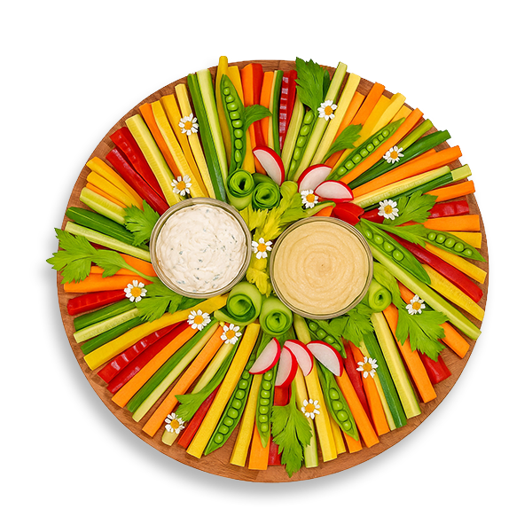 A mixture of vibrant fresh seasonal veggies with hummus and tzatziki sauce. Feeds 12