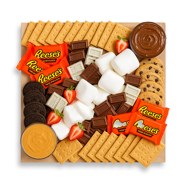 Graham crackers, oreos, chocolate chip cookies, marshmallows, hershey’s milk chocolate, hershey’s cookies n’ creme, reeses peanut butter cups, strawberries, nutella, and peanut butter
